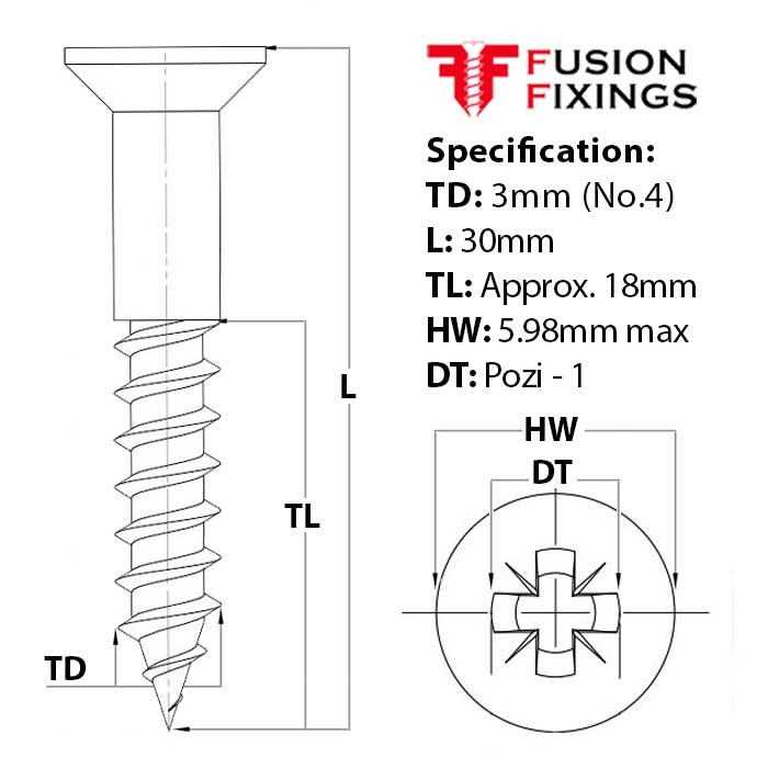 3mm (No.4) x 30mm Pozi Countersunk Wood Screw, A2 Stainless Steel, DIN 7997