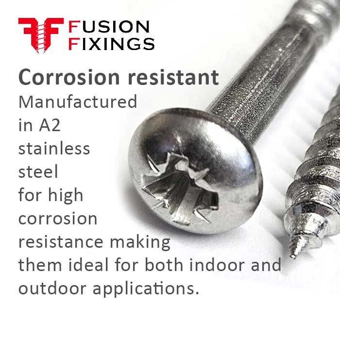 Corrosion resistant, high-strength, 4.5 x 35mm Pozi round head wood screw manufactured from A2 stainless steel that provides excellent corrosion resistance, making it ideal for both indoor and outdoor applications.