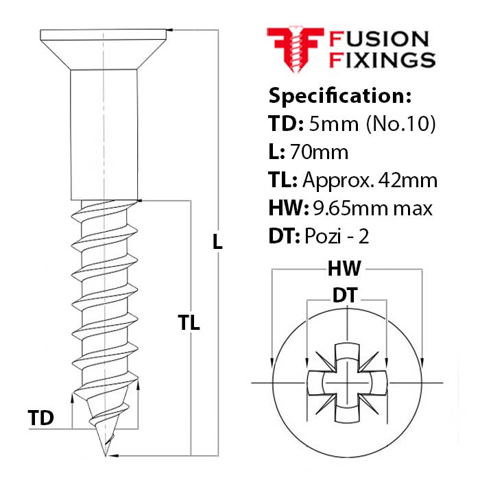 70mm countersunk wood screw specifications