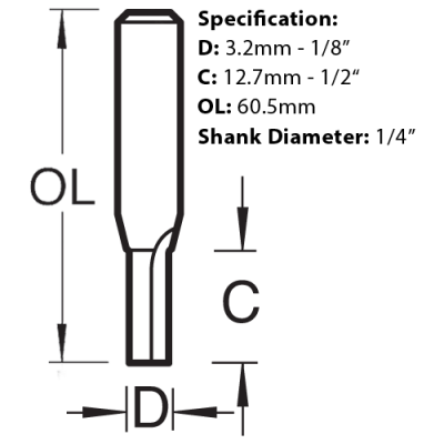 This 2 flute router cutter bit with its 3.2mm x 12.7mm cutting head is ideal for intricate work and used by the professional carpenter and DIY enthusiasts alike. With a two flute solid carbide insert for increased strength, offering cleaner cuts and the effective clearance of waste seen with many of the Trend router cutters.